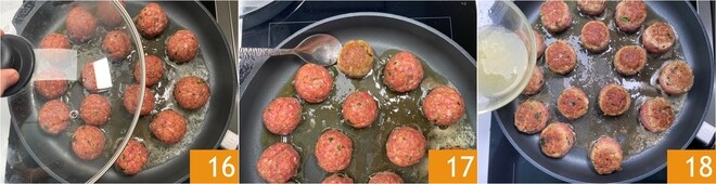 Dora las albóndigas durante 5 minutos a fuego medio-alto, cubriendo con una tapa. En este punto, da vuelta las albóndigas con una cuchara o espátula 17; si todavía no están doradas de ese lado, continúa la cocción por otros 2 minutos. Después de darles la vuelta, añade el jugo de limón 18.