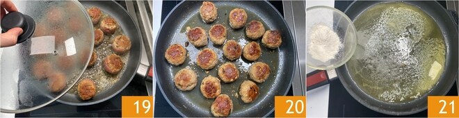 Vuelve a cubrir con la tapa 19 y continúa la cocción por otros 8 minutos. Una vez cocidas 20, retira las albóndigas de la sartén y mantenlas calientes. En la misma sartén, derrite la mantequilla para la salsa 21.