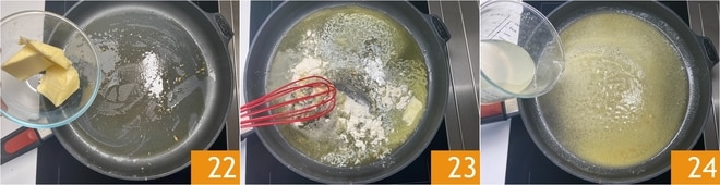 Una vez derretida, añade la harina 22 y mezcla con un batidor para evitar la formación de grumos 23. Ahora añade el jugo de limón y el caldo vegetal caliente 24.