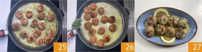 Vuelve a colocar las albóndigas en la sartén 23 y cocina a fuego bajo durante un minuto, mezclando delicadamente. Finalmente adorna con ralladura de limón y perejil 26. ¡Tus albóndigas al limón están listas para ser servidas aún calientes 27!