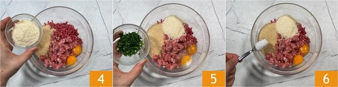 Agrega también el queso pecorino rallado 4, el perejil picado 5 y la sal 6.