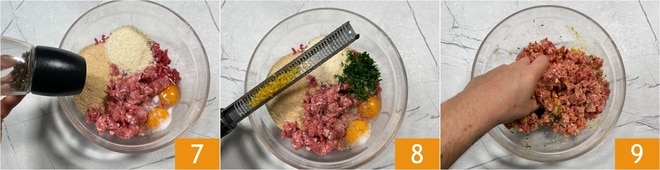 Finalmente sazona con una molienda de pimienta negra 7 y la ralladura de limón 8. Amasa enérgicamente con las manos para mezclarlo todo 9.