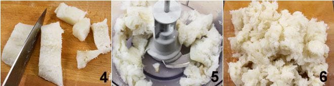 y luego córtalo en trozos 4. Quita las espinas de los filetes de bacalao con la ayuda de unas pinzas y tritúralos finamente con un cuchillo, o ponlos en la batidora durante unos segundos (5-6).