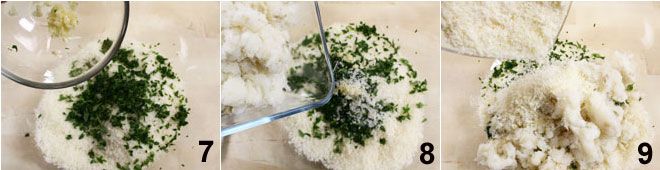 En un bol grande, pon la miga triturada, el perejil, el tomillo, el ajo 7, el bacalao 8 y por último el queso parmesano rallado 9.