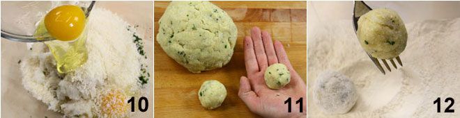 Añade luego dos huevos 10 y ajusta de sal y pimienta. Mezcla bien para integrar todo de manera que obtengas una masa compacta. Con las manos, forma pequeñas bolitas con la masa 11 y colócalas en una bandeja. Prepara tres boles: uno para la harina, otro para el pan rallado y otro donde poner un huevo batido. Pasa las bolitas primero por la harina 12,