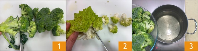 Para preparar las albóndigas de brócoli, lo primero que debes hacer es limpiar los brócolis: elimina las hojas del brócoli verde y saca solo las flores 1, luego haz lo mismo con el brócoli romanesco 2. Sumerge todas las flores en una olla de agua hirviendo 3.