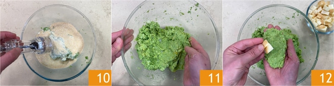 Ajusta de sal y pimienta 10, luego mezcla todo 11. Toma un poco de masa, aplánala y coloca en el centro un dado de scamorza 15.