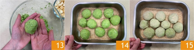 Cierra la masa sobre el relleno y forma una albóndiga 16. Repite el mismo procedimiento hasta agotar los ingredientes. Rueda las albóndigas en el pan rallado 17 para cubrirlas completamente 18.