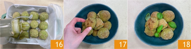 Coloca las albóndigas en una bandeja forrada con papel de horno, rocía con aceite 19 y cocina en horno estático precalentado a 180° durante 25 minutos, dándoles la vuelta a mitad de cocción. Emplata 20 y completa con algunas hojas de albahaca. ¡Tus albóndigas de brócoli están listas para ser servidas 21!