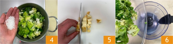 Añade la sal 4 y cocina hasta que estén blandas. Mientras tanto, corta la scamorza en dados 5. Escurre los brócolis y transfiérelos a una batidora 6, luego tritura hasta obtener una mezcla homogénea.