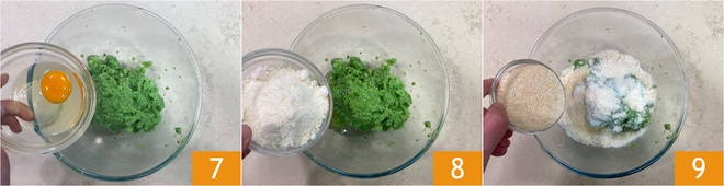 Vierte la mezcla en un bol y añade el huevo 7, el Parmigiano rallado 8 y el pan rallado 9.