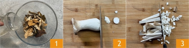 Para preparar el rollo de champiñones, primero coloca los porcini en remojo en agua fría durante 15 minutos 1. Mientras tanto, limpia los champiñones: elimina la base terrosa del tallo 2 y frótalos con un paño húmedo, luego córtalos en cubos de aproximadamente 1 cm 3.