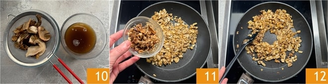 Mientras tanto, escurre los porcini secos y reserva el agua de remojo, te servirá más tarde para preparar la salsa 10. Pica groseramente los porcini y únelos en la sartén 11. Continúa dorando los champiñones hasta que estén bien dorados; tomará unos 10-15 minutos en total 12.