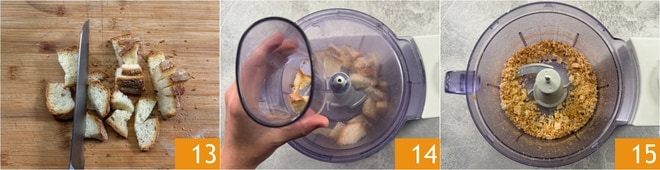Mientras tanto, corta el pan en trozos 13, transfiérelo a una licuadora 14 y tritura hasta reducirlo a migas 15.