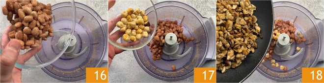 Reserva el pan rallado en un bol y coloca en la misma licuadora las judías precocidas 16, las avellanas 17 y los champiñones dorados 18. Activa las cuchillas para mezclar los ingredientes.
