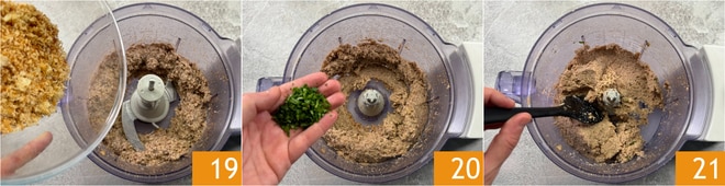 Añade el pan rallado 19 y vuelve a triturar hasta obtener una mezcla bastante homogénea, luego añade el perejil picado 20. Ajusta de sal y pimienta y mezcla bien 21.