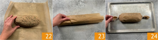 Extiende una hoja de papel de horno sobre la superficie de trabajo, coloca en el centro la mezcla de champiñones y moldéala en forma de rollo 22. Envuelve el papel de horno alrededor del rollo 23 y sella los extremos como si fuera un caramelo 24. Coloca el paquete en una bandeja y hornea en horno estático precalentado a 180°C durante 30 minutos.