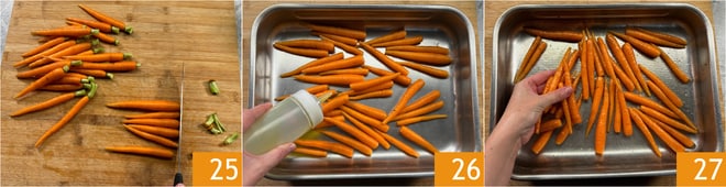 Mientras se hornea el rollo, prepárate para la guarnición: lava y corta las zanahorias 25, luego distribúyelas en una bandeja y sazona con aceite 26, sal y pimienta. Mezcla con las manos para sazonar las zanahorias de manera uniforme, luego hornea la bandeja junto con el rollo y cocina durante 25-30 minutos.