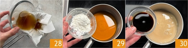 Mientras tanto, prepara la salsa: filtra el agua de remojo de los champiñones con un paño de papel 28 y vierte 200 g en un cazo junto con la maicena 29 y la salsa de soja 30.