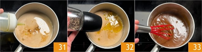 Añade el aceite 31 y la pimienta 32, luego enciende el fuego y deja espesar, removiendo con frecuencia, hasta obtener una salsa lisa y densa 33.
