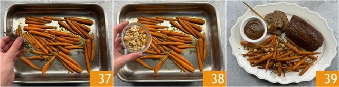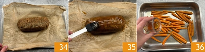 Pasados 30 minutos, saca el rollo del horno y abre el paquete 34, luego píntalo con la salsa de champiñones 35. Hornea el rollo descubierto y cocina durante otros 20 minutos, siempre a 180°C. Una vez cocidas, saca también las zanahorias y rocíalas con el sirope de arce 36.