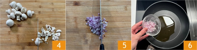 Haz lo mismo con los champiñones 4. Finalmente, pela y pica la chalota 5. En una sartén antiadherente calienta un poco de aceite y añade la chalota 6.