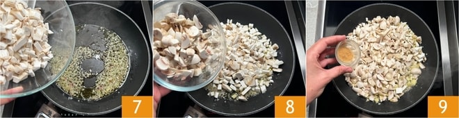 Sofríe durante unos minutos, luego añade los champiñones cardoncelli 7 y los champiñones 8. Sazona con sal, pimienta y jengibre 9. Mezcla y dora durante unos 5 minutos a fuego alto.
