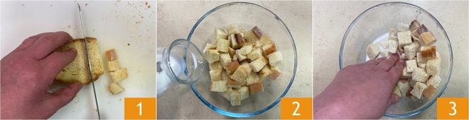 Para preparar el rollo de carne suave, lo primero que tienes que hacer es preparar el Caldo de carne y mantenerlo caliente. Reduce el pan duro a cubitos 1, colócalo en un bol y añade la leche 2. Aplástalo con las manos para asegurarte de que se empape completamente 3, luego déjalo en remojo durante unos diez minutos.