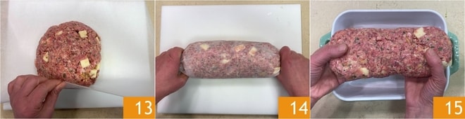 Coloca la mezcla en el centro de una hoja de papel de horno 13 y úsala para modelarlo y darle la forma de un rollo de carne 14. Ahora elimina el papel y transfiere el rollo de carne a una bandeja para hornear 15.