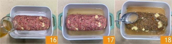 Vierte el caldo sobre el rollo de carne y en la bandeja 16, luego hornea en el horno estático precalentado a 180° durante unos 45 minutos 17. Durante la cocción, humedece el rollo de carne de vez en cuando con el caldo para asegurarte de que permanezca húmedo 18.