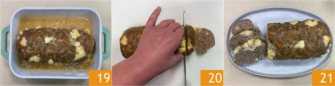 Cuando el rollo de carne esté dorado en la superficie, verifica con una sonda para carnes que la temperatura en el centro sea de al menos 70°, luego sácalo del horno y déjalo reposar en la bandeja durante 10-15 minutos 19; de esta manera, los jugos se distribuirán uniformemente manteniendo el rollo de carne suave. Transcurrido el tiempo de reposo, tu rollo de carne suave estará listo para ser cortado en rebanadas 20 y servido 21!
