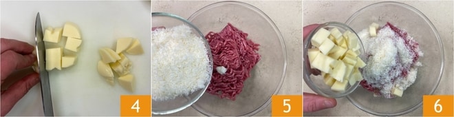 Mientras tanto, corta la provola en cubitos también 4. Pon la carne picada en un bol grande, luego añade el queso parmesano rallado 5 y la provola en cubitos 6.