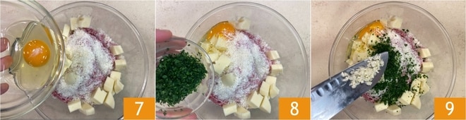 Agrega también el huevo 7, el perejil picado 8 y el diente de ajo picado 9.