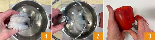Para preparar el pulpo a la parrilla, como primer paso sumerge el pulpo en agua hirviendo 1, cubre con una tapa 2 y cocina durante 40 min. Mientras tanto, pela el pimiento 3.