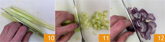 Limpia el pepino, elimina las semillas y luego córtalo primero en tiras 10 y luego en pequeños cubos 11. Corta también la cebolla en rodajas finas 12.