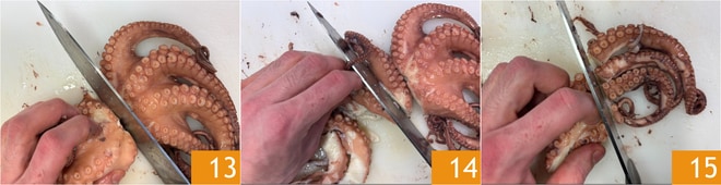 Una vez cocido, escurre el pulpo y córtalo en trozos 13 14 dejando intactos los tentáculos 15.