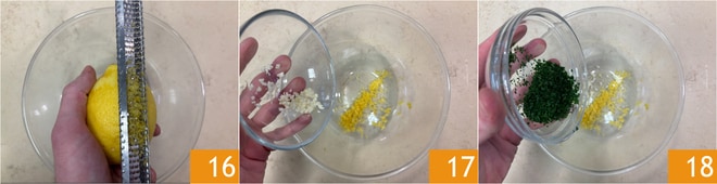 En un bol, coloca la ralladura de limón 16, el ajo picado 17 y el perejil picado 18.