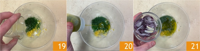 Añade el zumo de limón 19, el aceite 20, las cebollas 21, sal y pimienta. Mezcla bien para amalgamar los ingredientes.