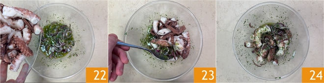 Agrega el pulpo 22, mezcla 23 y deja marinar durante 30 minutos 24.