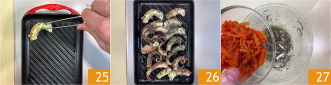 Cocina el pulpo en una parrilla 25 durante 3-4 minutos por cada lado 26. En el mismo bol donde has marinado el pulpo, añade los pimientos 27.