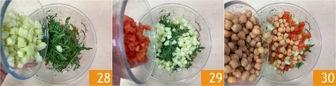 Añade la rúcula, previamente lavada y secada, el pepino 28, el tomate 29 y los garbanzos precocinados 30. Mezcla para amalgamar todo.