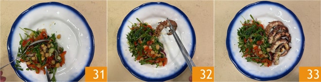 Sirve la ensalada 31 y coloca al lado el pulpo 32. El pulpo a la parrilla está listo para ser disfrutado 33.