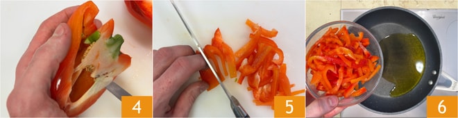 Córtalo por la mitad y elimina las semillas y los filamentos internos 4. Redúcelo a tiras 5. En una sartén, vierte un poco de aceite y añade los pimientos 6.