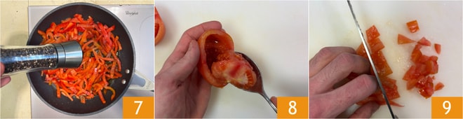 Condimenta con sal y pimienta 7 y saltea durante unos 5 minutos. Vacía el tomate eliminando las semillas y la parte central más dura 8. Córtalos en pequeños cubos 9.
