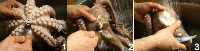 Limpia el pulpo bajo agua corriente, quitándole las vísceras, el diente central 1, los ojos 2 y, en lo posible, la capa viscosa que recubre el pulpo.