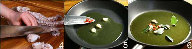 Corta ahora el pulpo en pedazos grandes como máximo como una nuez 4, cortarlo en trozos más grandes solo tendría el resultado de alargar los tiempos de cocción. En una cacerola vierte el aceite y pon los dientes de ajo enteros a dorar 5, añade las hojas de laurel, el ají cortado en trocitos 6 teniendo la precaución de eliminar en todo o en parte las semillas si no se desea un plato demasiado picante.