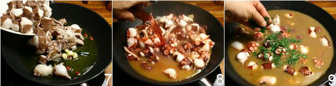 Añade ahora el pulpo en trozos 7 y saltéalo unos instantes, después añade el vino tinto 8, un poco de perejil picado 9, lleva a ebullición y baja el fuego; cubre con una tapa y cocina durante al menos 40/50 minutos dependiendo de la dureza del pulpo. Si la salsa se reduce demasiado, añade unas cucharadas de agua. Pocos instantes antes de retirar del fuego el pulpo borracho, añade una generosa cantidad de perejil picado, ajusta de sal y deja que se enfríe unos minutos.