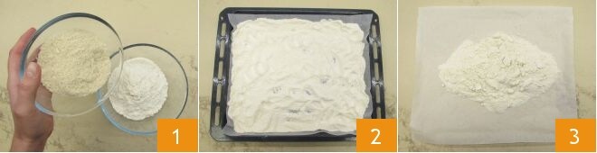 Para preparar los polvorones, primero mezcla la harina 00 y la harina de almendra en un bol 1, mezcla bien y distribuye la mezcla sobre una bandeja forrada con papel de horno 2. Tuesta las harinas en un horno ventilado precalentado a 130° durante unos 20 minutos, luego retira del horno y deja enfriar durante al menos 30 minutos 3. Si el ventilador de tu horno es demasiado fuerte, para evitar que se dispersen, puedes tostar las harinas en un horno estático a la misma temperatura.