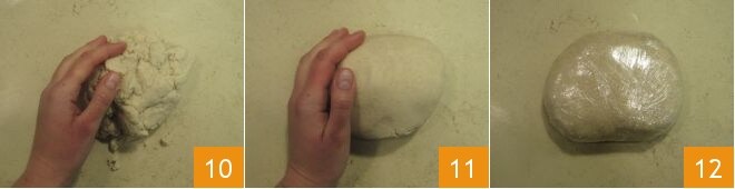 Transfiere la mezcla obtenida a la superficie de trabajo y comienza a trabajarla con las manos 10: al no tener huevos, al principio la mezcla será difícil de compactar, pero al final lograrás obtener un bloque liso y uniforme 11. Envuelve la masa en film transparente 12 y deja reposar a temperatura ambiente durante 20 minutos.