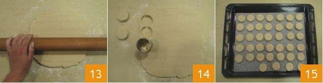 Después del tiempo de reposo, extiende la masa hasta un grosor de 1 cm 13, luego corta las galletas usando un cortador circular de 4 cm de diámetro 14. Coloca con cuidado las galletas en una bandeja forrada con papel de horno 15 y hornea en un horno estático precalentado a 160°-170° durante unos 20 minutos, colocando la bandeja en el estante central.